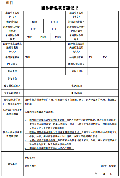 2.項目申請單位應具備與團體標準相關的工作基礎,有配套的技術、設備和人員條件,已經做好標準編制的前期準備工作,對項目的目的意義、必要性和可行性、適用范圍、主要技術內容、國內外情況等進行了必要的前期研究。