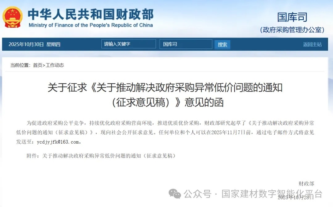 10月28日,財(cái)政部發(fā)布關(guān)于征求《關(guān)于推動(dòng)解決政府采購(gòu)異常低價(jià)問(wèn)題的通知(征求意見(jiàn)稿)》意見(jiàn)的函。